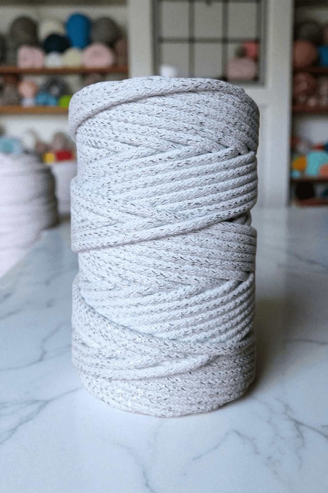 Przedmiotem oferty jest sznurek 6mm o nawoju 100m (możemy nawinąć większą ilość metrów w jednym kawałku) w kolorze ŚNIEŻYNKA tj biały z dodatkiem srebrnej, opalizującej nici.