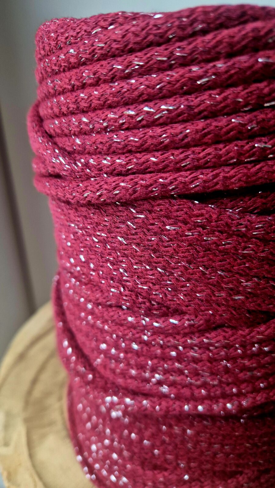 Przedmiotem oferty jest sznurek 6mm o nawoju 100m (możemy nawinąć większą ilość metrów w jednym kawałku) w kolorze WINO/SREBRO tj wino z dodatkiem srebrnej, opalizującej nici.