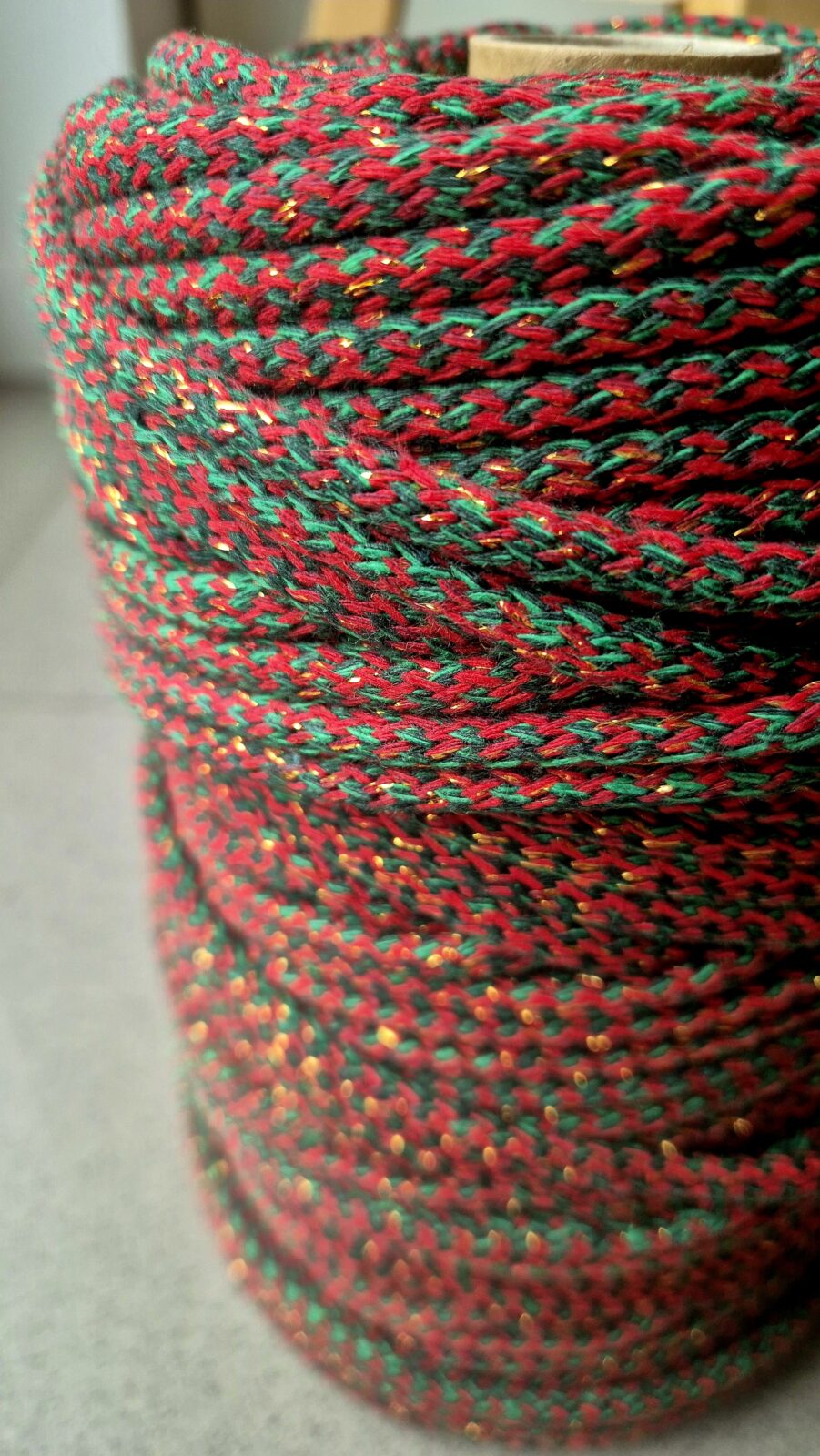 Przedmiotem oferty jest sznurek 6mm o nawoju 100m (możemy nawinąć większą ilość metrów w jednym kawałku) w kolorze ŚWIĄTECZNY ZE ZŁOTEM tj miks świątecznych odcieni z dodatkiem złotej, opalizującej nici.